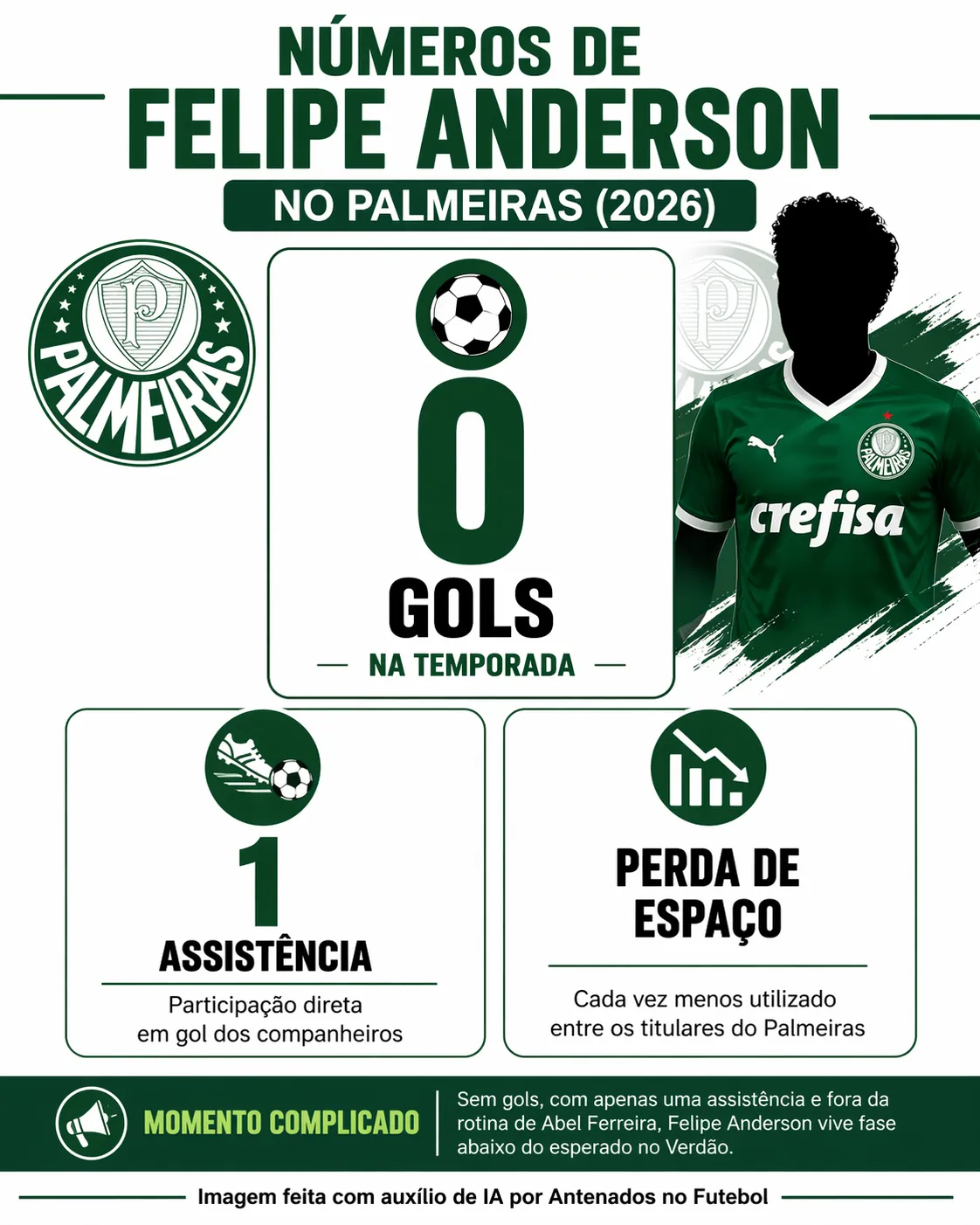 Felipe Anderson chegou ao Palmeiras como a principal aposta de criatividade da temporada, mas seu rendimento ficou muito aquém do esperado. Em um time que exige intensidade, mobilidade e protagonismo, o meia não conseguiu corresponder em nenhum desses pontos.
