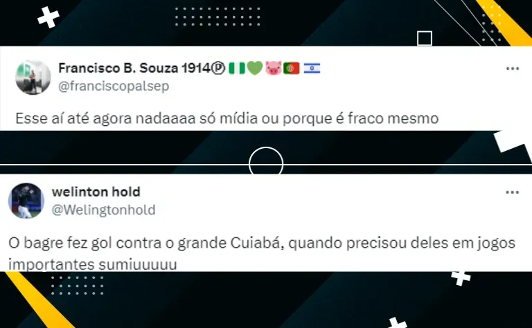 “Felipe está mal demais, é a contratação que mais decepcionou até aqui”. “É lógico que o cara fez poucos jogos e tudo mais, porém, chegou gerando uma baita expectativa e já está virando chacota entre os torcedores dos nossos adversários”.