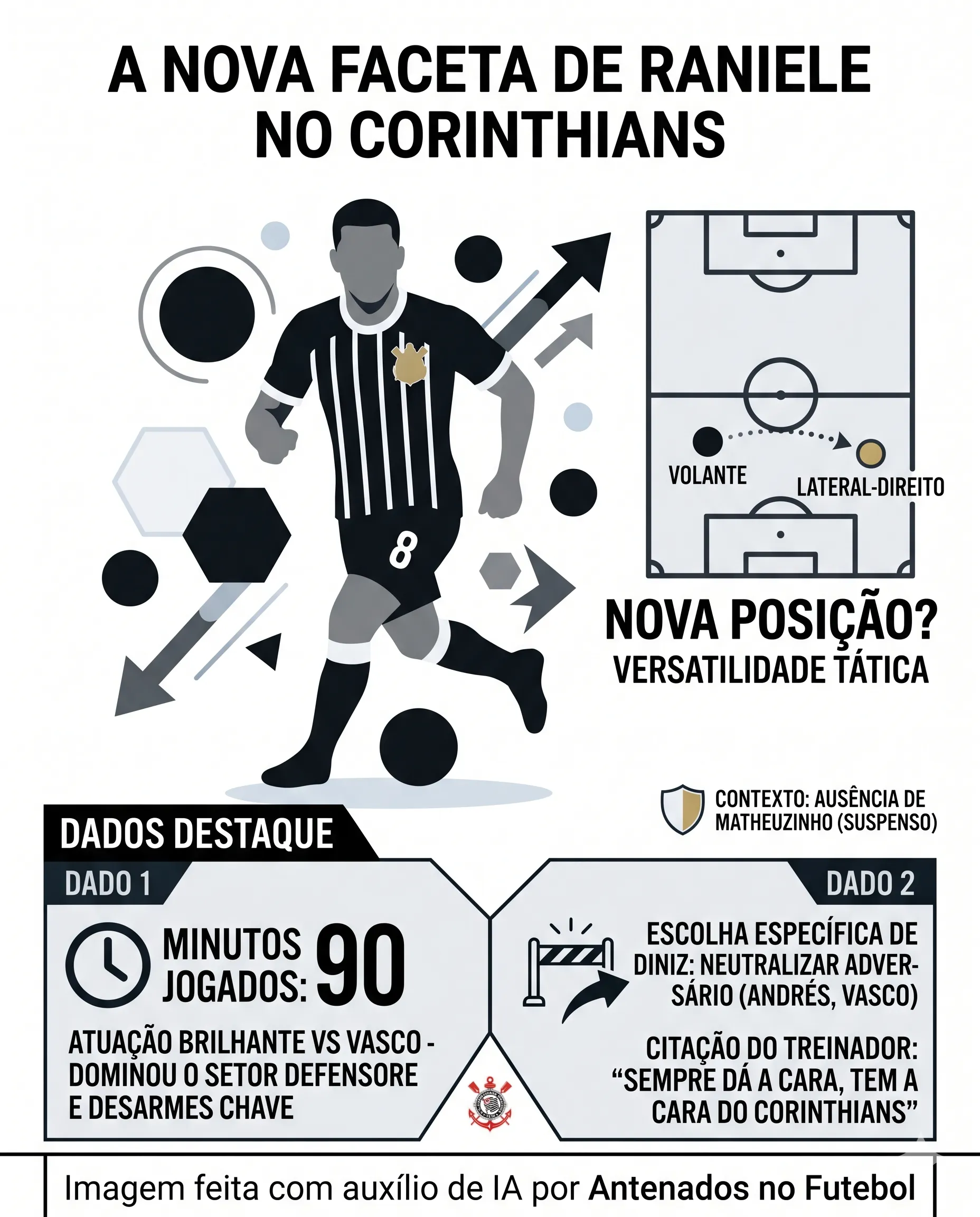 O Corinthians segue em boa fase sob o comando de Fernando Diniz e, neste domingo (26), venceu o Vasco por 1 a 0 pelo Brasileirão. No entanto, a escalação chamou atenção dos torcedores, principalmente pela utilização de Raniele atuando como lateral-direito.