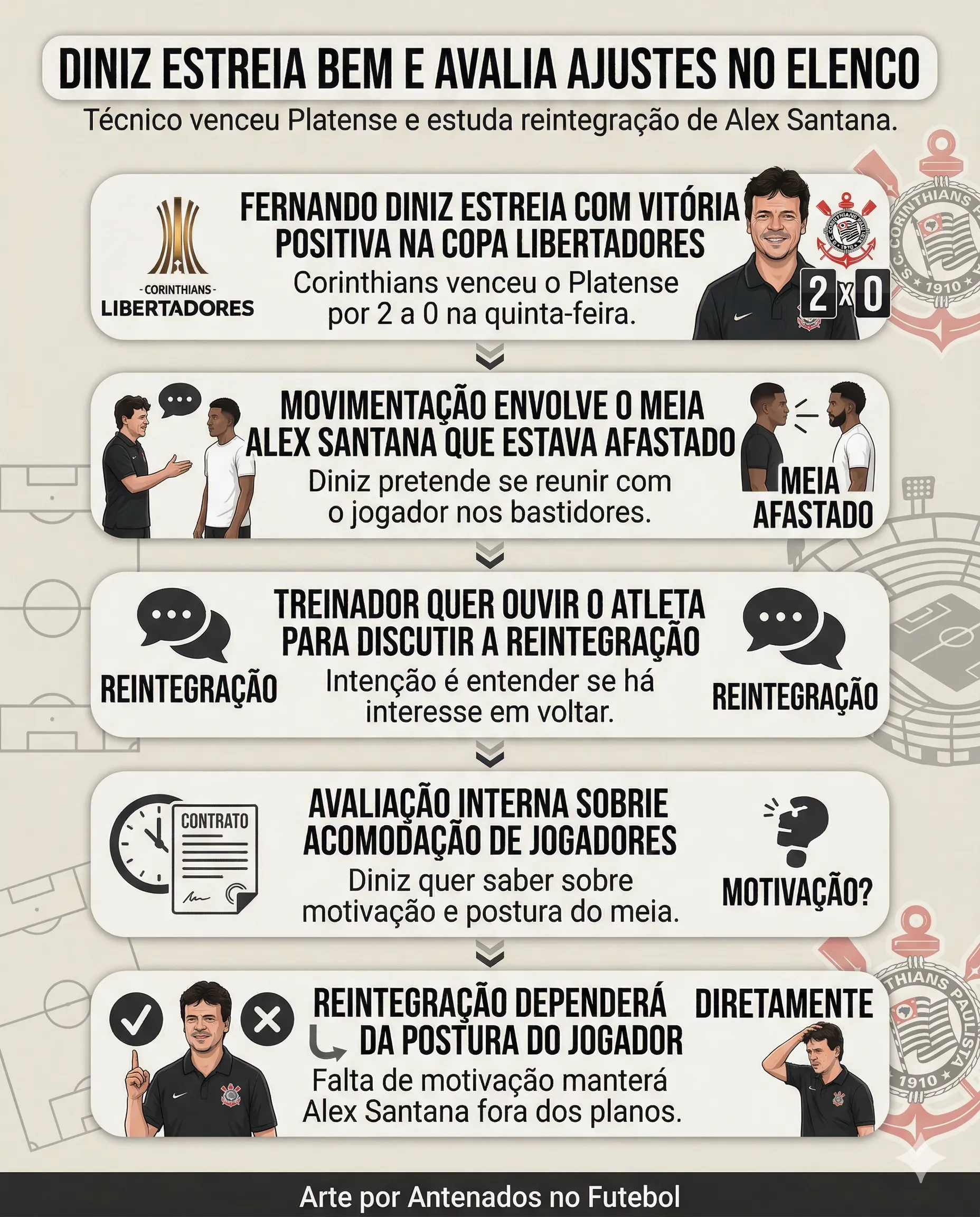 O Corinthians agora conta com o comando do técnico Fernando Diniz, que estreou de forma positiva ao vencer o Platense por 2 a 0 na Copa Libertadores nesta quinta-feira (9). Internamente, o treinador também começa a promover ajustes no elenco, e um nome voltou a ganhar destaque nos bastidores.