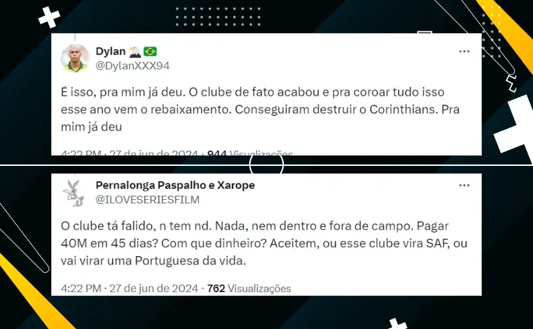 Em meio a toda essa turbulência e com António Oliveira pressionado no cargo, o Corinthians se prepara para o clássico contra o Palmeiras. A partida está marcada para segunda-feira (1), às 20h, no Allianz Parque. O jogo é válido pela 13ª rodada do Brasileirão.