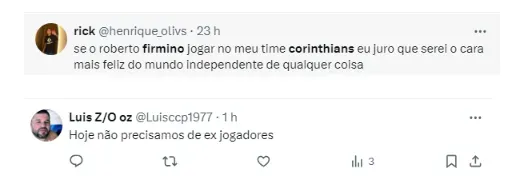 No entanto, outro jogador também atraiu a atenção dos corinthianos justamente pelo bom desempenho do camisa 77. Trata-se de Roberto Firmino, que interagiu com o meia em um post nas redes sociais.