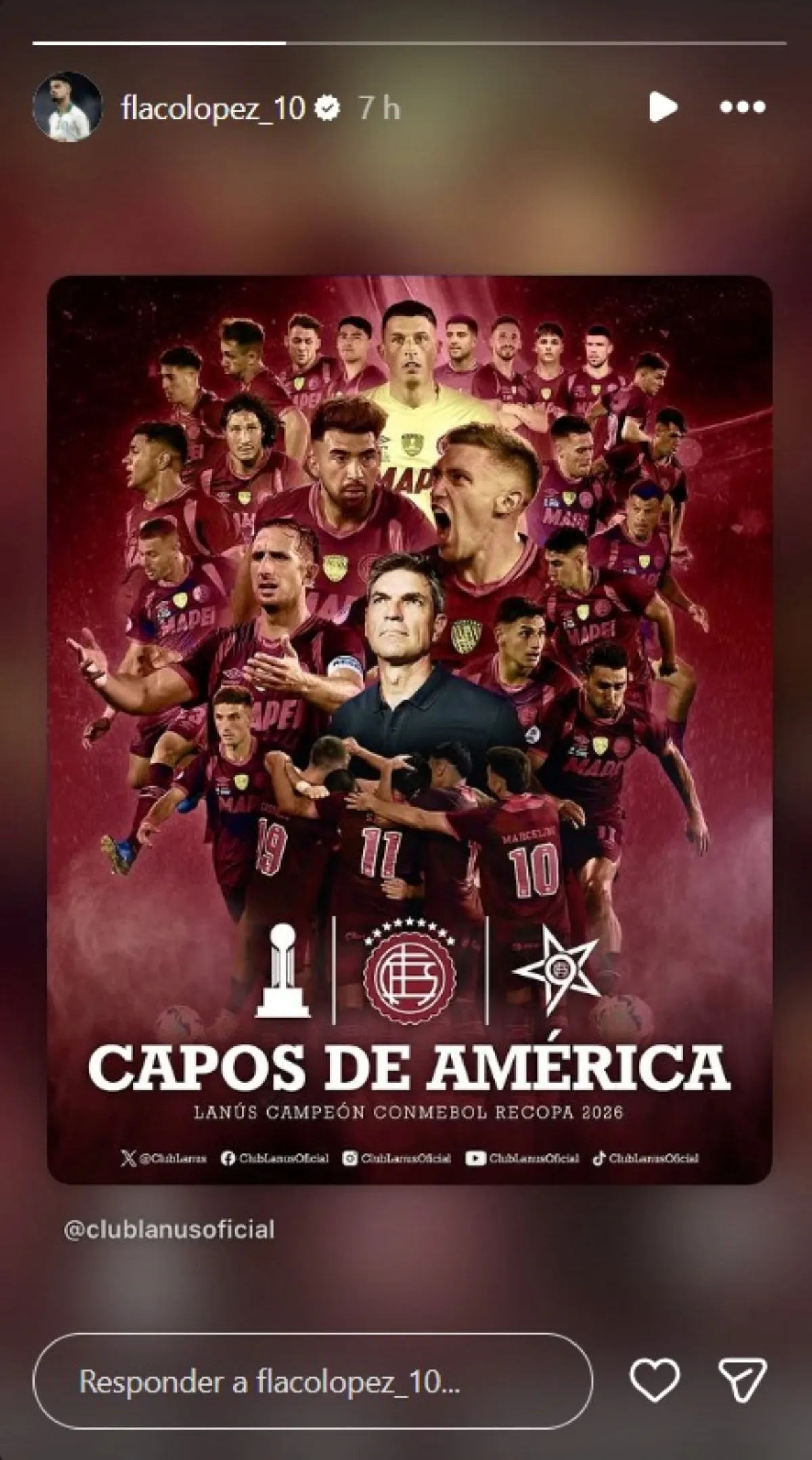 Flaco López, atacante do Palmeiras, utilizou as redes sociais para comemorar o título do Lanús sobre o Flamengo na Recopa Sul-Americana. Revelado nas categorias de base do clube argentino, o jogador demonstrou publicamente a ligação com a equipe que o projetou no futebol profissional.