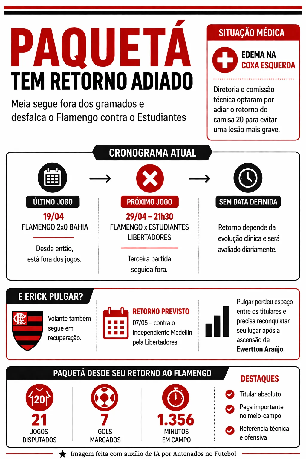 Fora desde a vitória por 2 a 0 sobre o Bahia, no dia 19 de abril de 2026, Lucas Paquetá deve seguir como desfalque do Flamengo nos próximos compromissos da equipe carioca. Segundo apuração de Mônica Alves, a diretoria trata o caso com cautela máxima para evitar que o edema na coxa esquerda evolua e se torne um problema ainda maior.