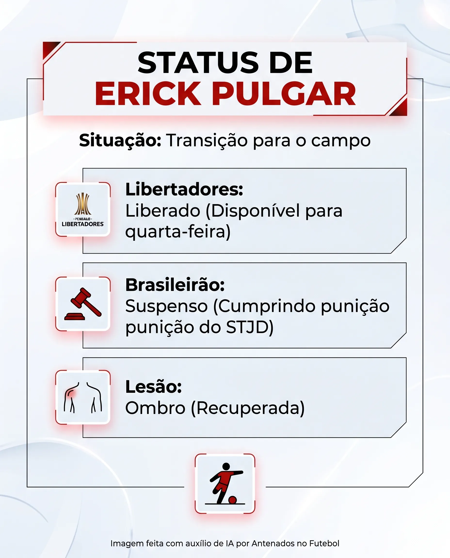 Além da recuperação clínica, o retorno do jogador também se beneficia de uma questão disciplinar que não interfere na Libertadores. Punido pelo STJD após expulsão no Brasileirão, o volante já cumpre suspensão na competição nacional, o que não impede sua utilização no torneio continental.