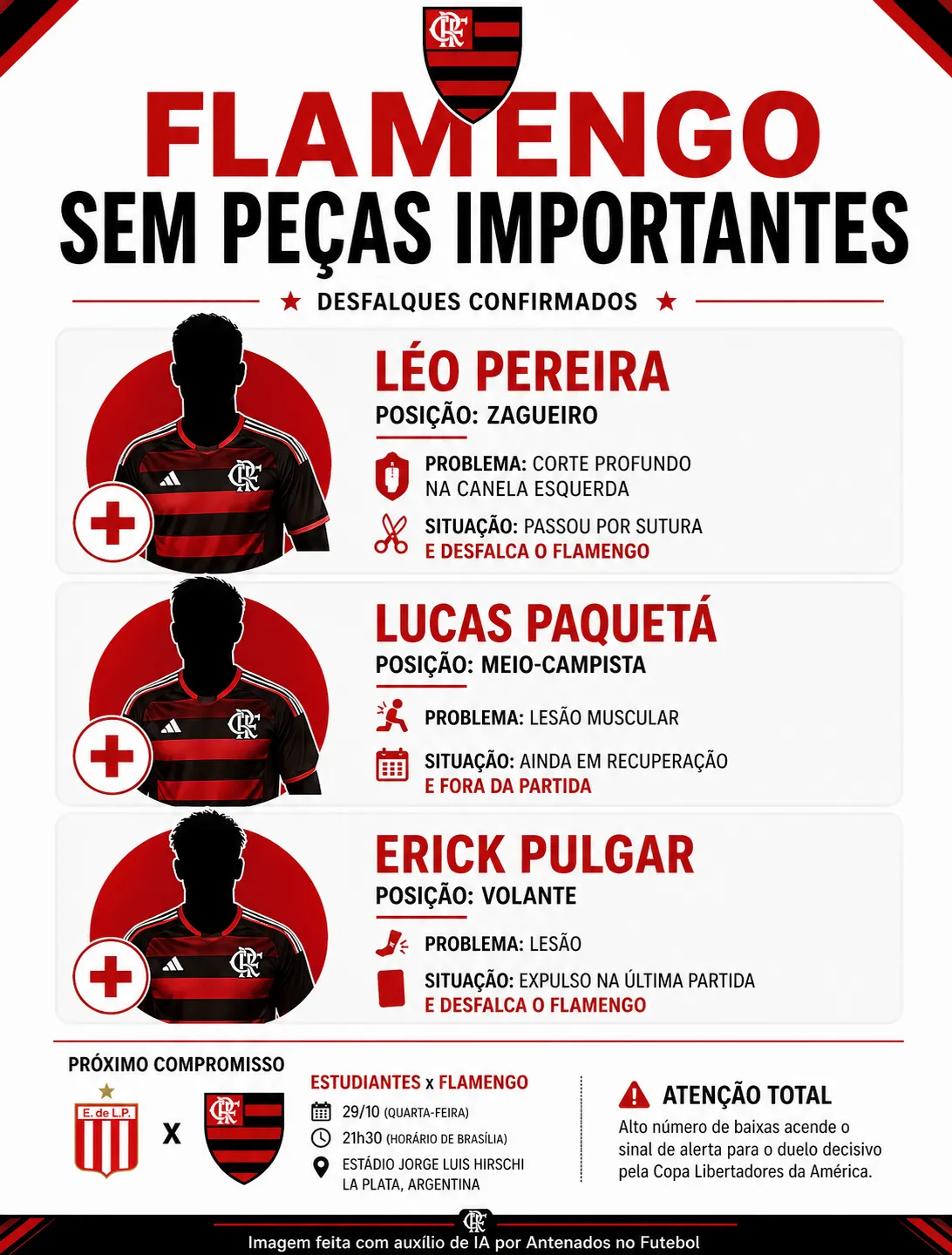 A longa lista de desfalques naturalmente preocupa, mas está longe de colocar o Flamengo em condição de fragilidade. Poucos clubes no continente possuem elenco tão profundo e qualificado para absorver ausências importantes sem perder competitividade. Mesmo sem nomes como Léo Pereira, Lucas Paquetá e Erick Pulgar, o time segue com opções capazes de manter alto nível em uma partida decisiva de Copa Libertadores da América.