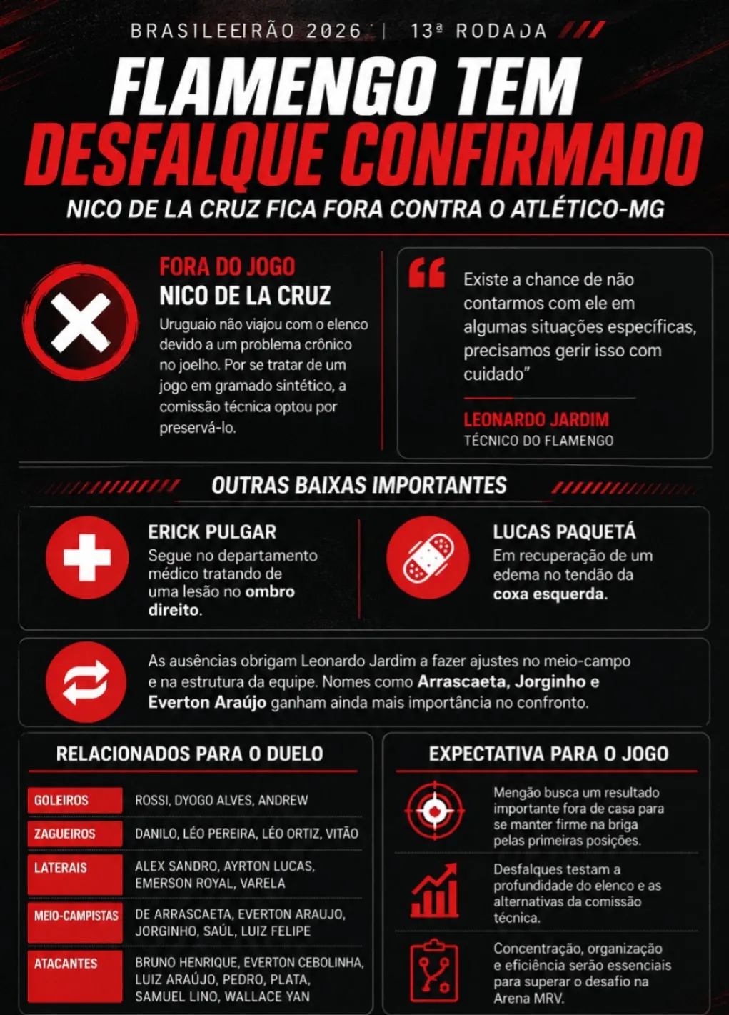 Dessa maneira, as ausências obrigam Leonardo Jardim a fazer ajustes no meio-campo e na estrutura da equipe. Contudo, o elenco ainda conta com opções como Arrascaeta, Jorginho e Everton Araújo para manter o nível competitivo no confronto.