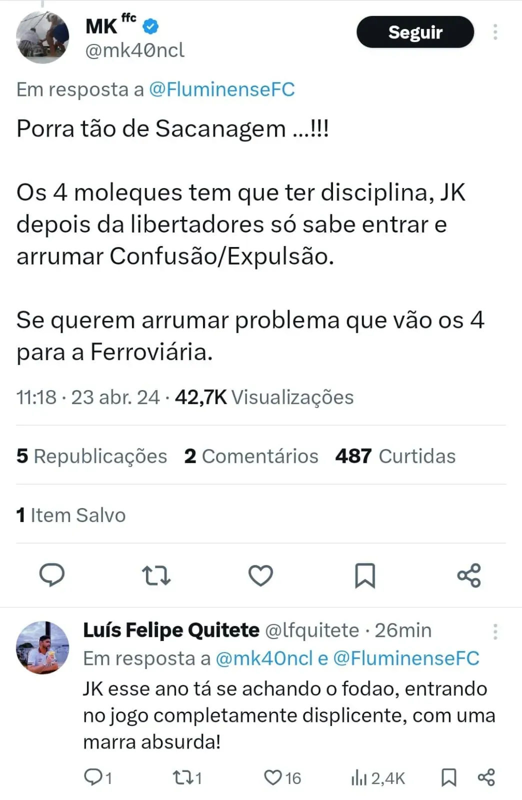 Nesta terça-feira (23), o Tricolor das Laranjeiras informou através de nota oficial, que os jogadores John Kennedy, Kauã Elias, Arthur e Alexsander foram afastados devido a atos de indisciplina cometidos durante a concentração para o duelo contra o Vasco, no último sábado (20). O Fluzão venceu o clássico por 2 a 1.