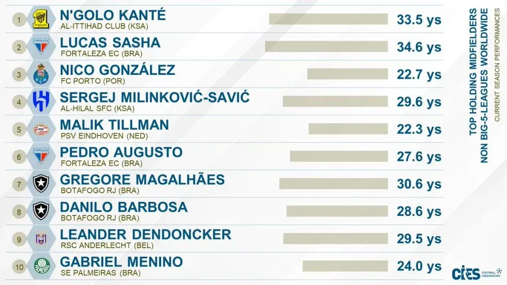 Além de Sasha, o top 3 da lista do CIES é completado pelo espanhol Nico González, do Porto. Lucas Sasha, o único brasileiro no top 5, acumula nesta temporada 36 jogos, 1 gol e 1 assistência pelo Fortaleza, e está prestes a atingir a marca de 100 partidas pelo clube, com 98 jogos até o momento.
