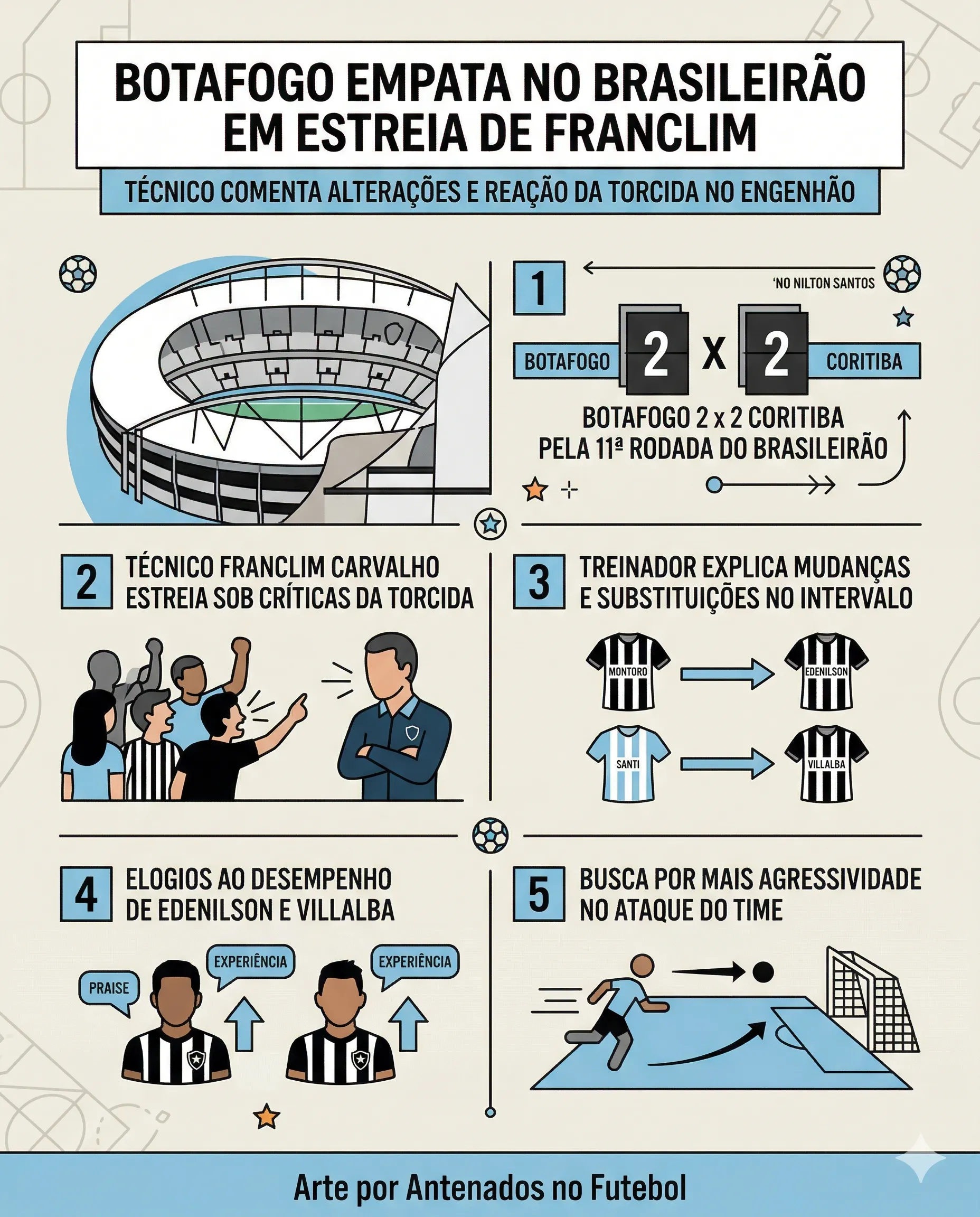 O Botafogo segue com desempenho abaixo e, neste domingo (12), empatou em 2 a 2 com o Coritiba, no Nilton Santos, pela 11ª rodada do Brasileirão Série A. A partida marcou a estreia do técnico Franclim Carvalho na competição nacional.