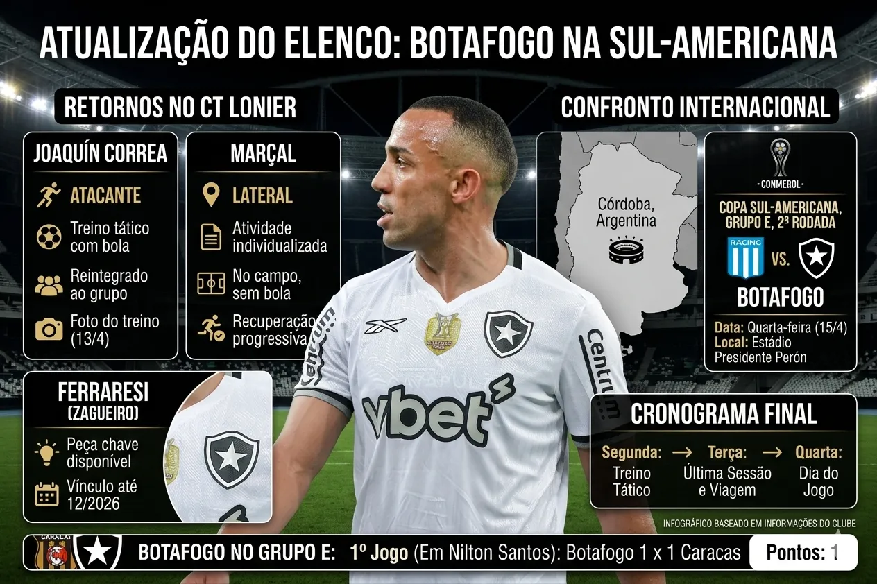 O elenco do Botafogo registrou as presenças de Joaquín Correa e Marçal nas atividades realizadas no CT Lonier nesta segunda-feira (13). Os atletas não participam de uma partida oficial desde o triunfo sobre o Red Bull Bragantino, ocorrido em 21 de março, que marcou a despedida do treinador Martín Anselmi.