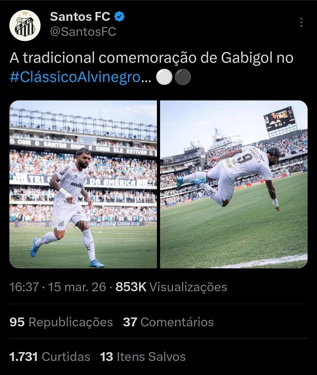 Após marcar o gol santista, Gabigol fez uma comemoração que chamou atenção e depois reagiu à publicação do próprio Santos nas redes sociais. O clube havia divulgado o momento afirmando: “A tradicional comemoração de Gabigol no #ClássicoAlvinegro”.
