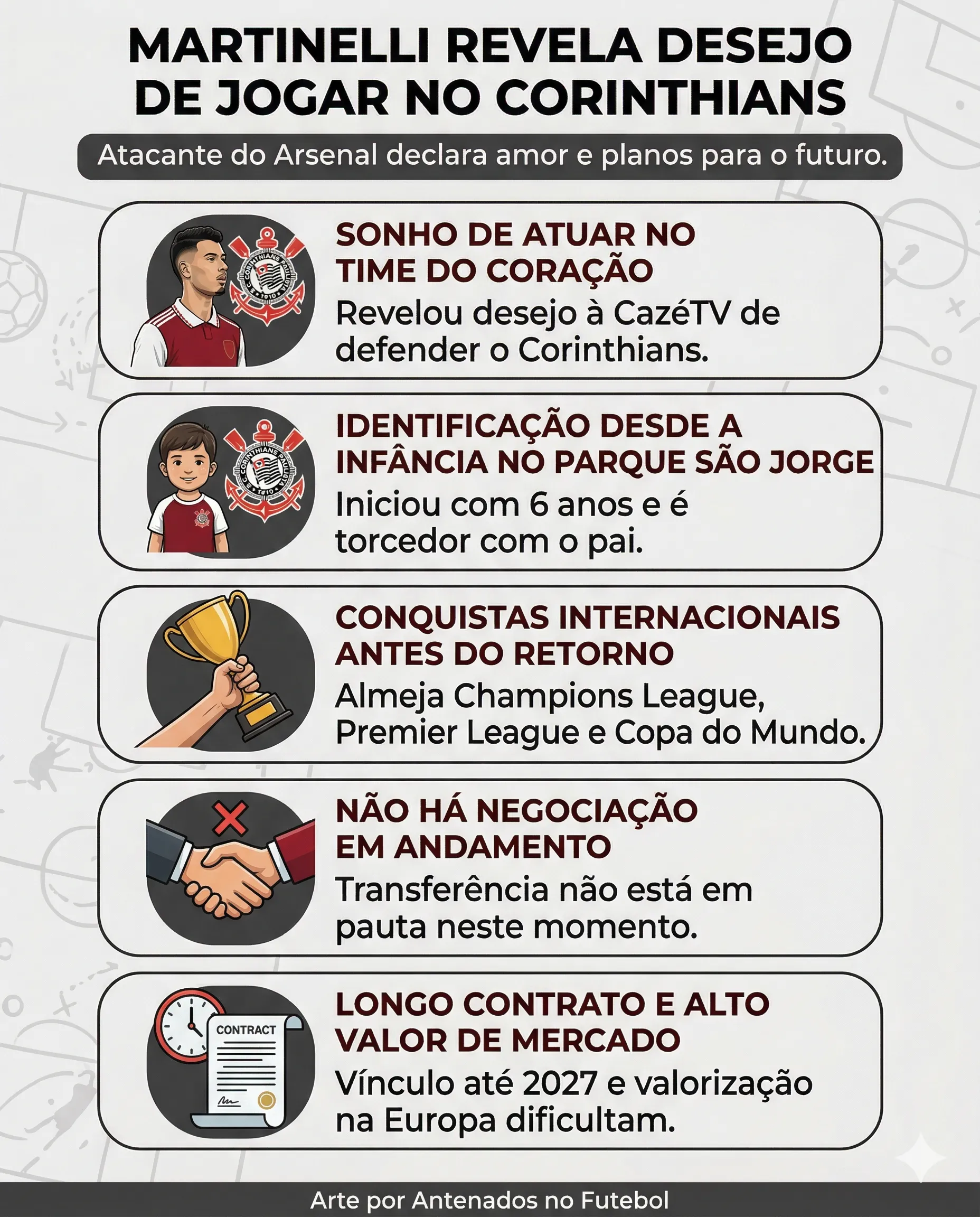 Apesar da declaração, não há qualquer negociação em andamento entre Corinthians e Martinelli neste momento. O atacante tem contrato com o Arsenal até 2027, o que dificulta qualquer possibilidade de transferência no curto prazo.