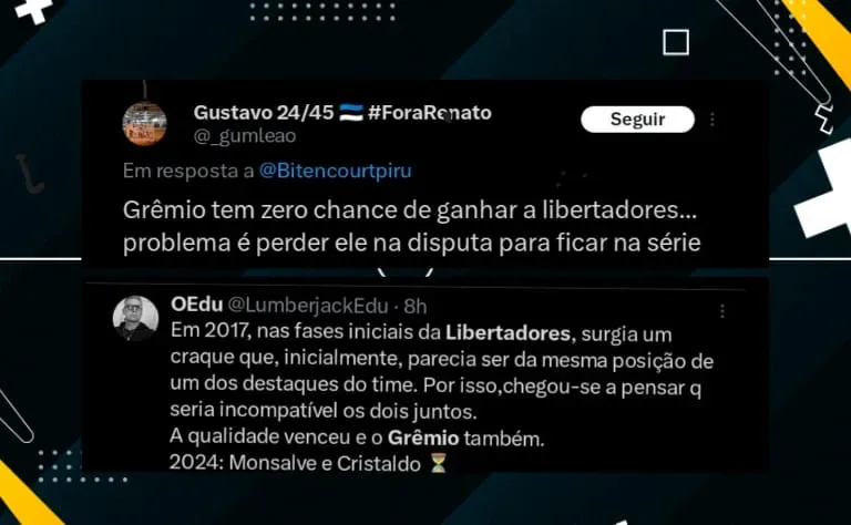 Renato deu continuidade, falando sobre o foco do Tricolor nas oitavas de final da Libertadores, contra o Fluminense. No jogo de ida, a equipe gaúcha venceu por 2 a 1; agora, a decisão será na terça-feira (20), às 19h, no Maracanã.