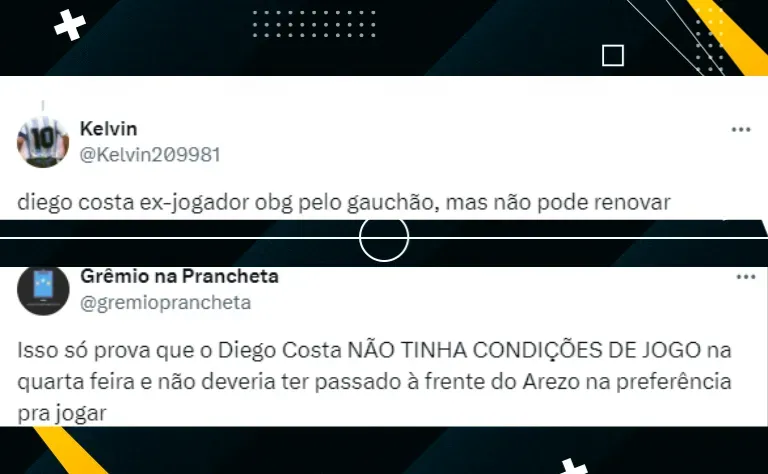 “Diego Costa fez um belo gauchão, porém, não pode continuar por aqui“. “Esse cara está de brincadeira, nunca melhora”. “Sorte que temos o Martin Braithwaite, não dá para contar com o veterano”. “Ele tem que se recuperar, chega de ser desfalque”.