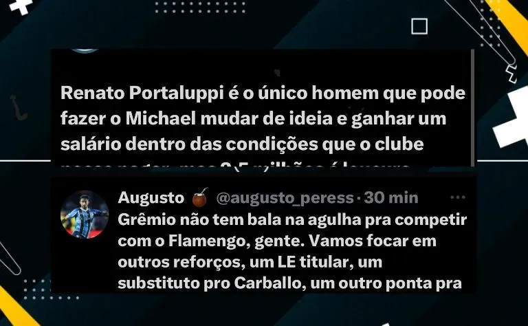 Apesar de ter chances de retornar ao Rubro-Negro, a torcida do Grêmio também se mantém otimista para atravessar a negociação: (SIC) “Renato Portaluppi é o único homem que pode fazer o Michael mudar de ideia e ganhar um salário dentro das condições que o clube possa pagar, mas 2,5 milhões é loucura”, disse.