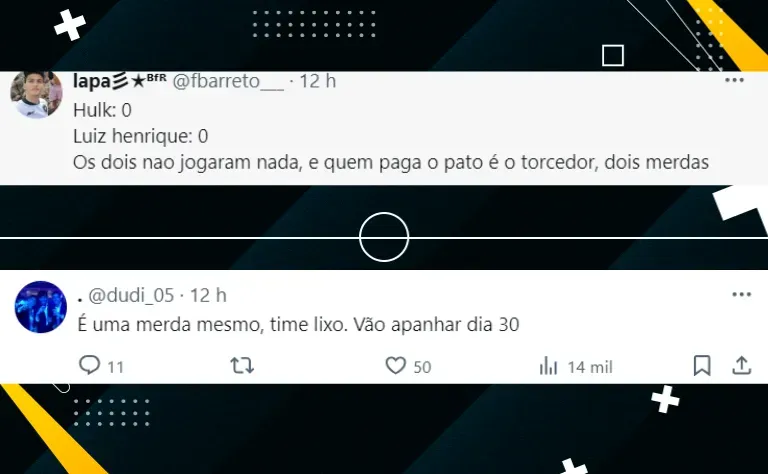 “Primeiro, ele (Luiz Henrique) tem cinco jogos pela Seleção e acha que é craque. Não ganhou porra nenhuma. Falou no intervalo do jogo que o Atlético é time de merda. Falou para o nosso goleiro que nosso time é uma merda. Ele deu cinco chutes na Seleção. Eu passei sete anos na Seleção. Ele tem que correr muito e respeitar,” disparou Hulk em conversa com o técnico Artur Jorge.