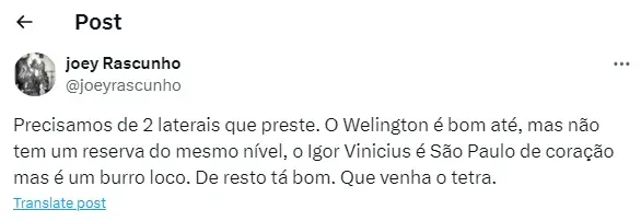 “O cara é muito fraco, não tem condição nenhuma de jogar pelo nosso clube”. “Nossa direção precisa acordar e trazer uma nova peça para o setor, não dá para jogar o mata-mata com ele”. “Esse ruim, fico nervoso todo jogo que assisto com ele em campo”.