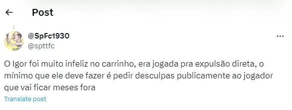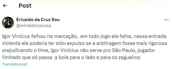 Ainda citando a partida diante dos equatorianos, mesmo com Luciano e cia passando em branco, um jogador da defesa virou ‘alvo’ da torcida após o embate: o lateral-direito Igor Vinícius. Sendo assim, os seguintes comentários vieram à tona.
