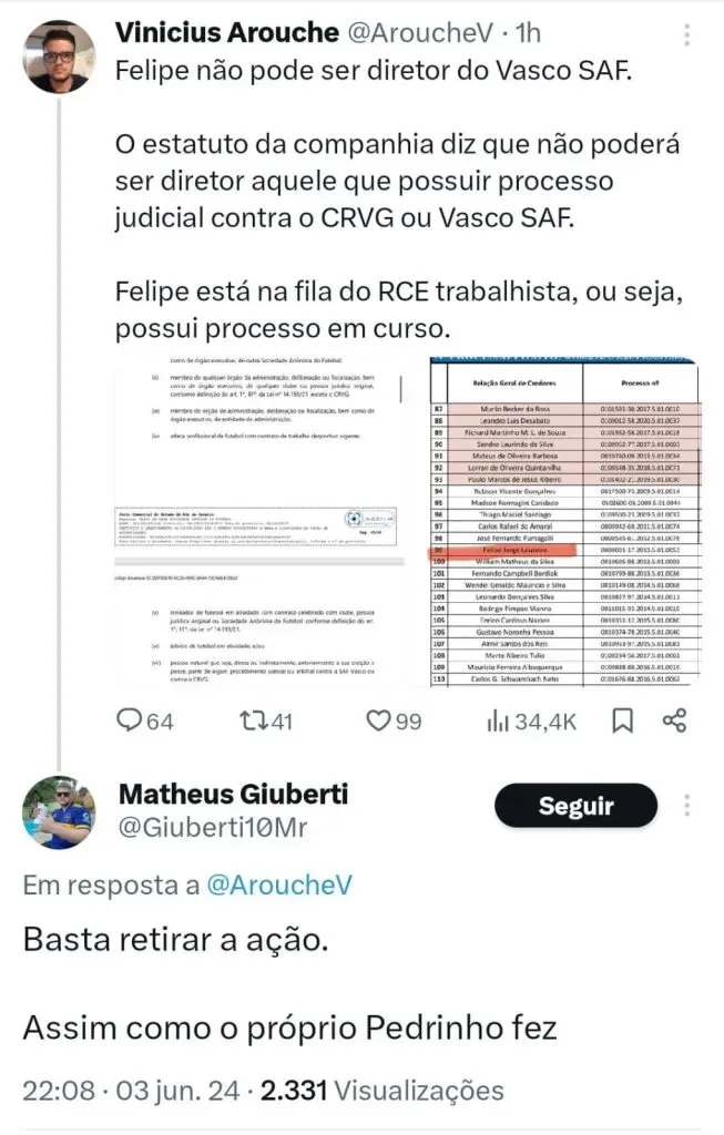 A questão é que as polêmicas parecem cercar o clube neste momento. Isso porque um possível impedimento para a efetivação de Felipe foi apresentado. “Felipe não pode ser diretor do Vasco SAF. O estatuto da companhia diz que não poderá ser diretor aquele que possuir processo judicial contra o CRVG ou Vasco SAF. Felipe está na fila do RCE trabalhista, ou seja, possui processo em curso”, postou Vinicius Arouche, advogado e sócio do clube.