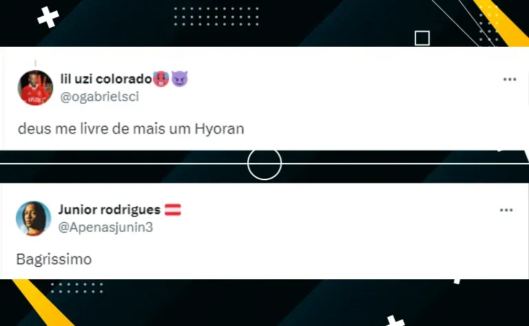 “Esse aí é bagre, espero que não venha“. “Ele é tipo o Hyoran, espero que Roger não aprove esse nome”. “É óbvio que precisamos de um novo meia de forma imediata, porém, Gabriel não é o nome ideal para assumir o lugar do nosso Alan Patrick”.
