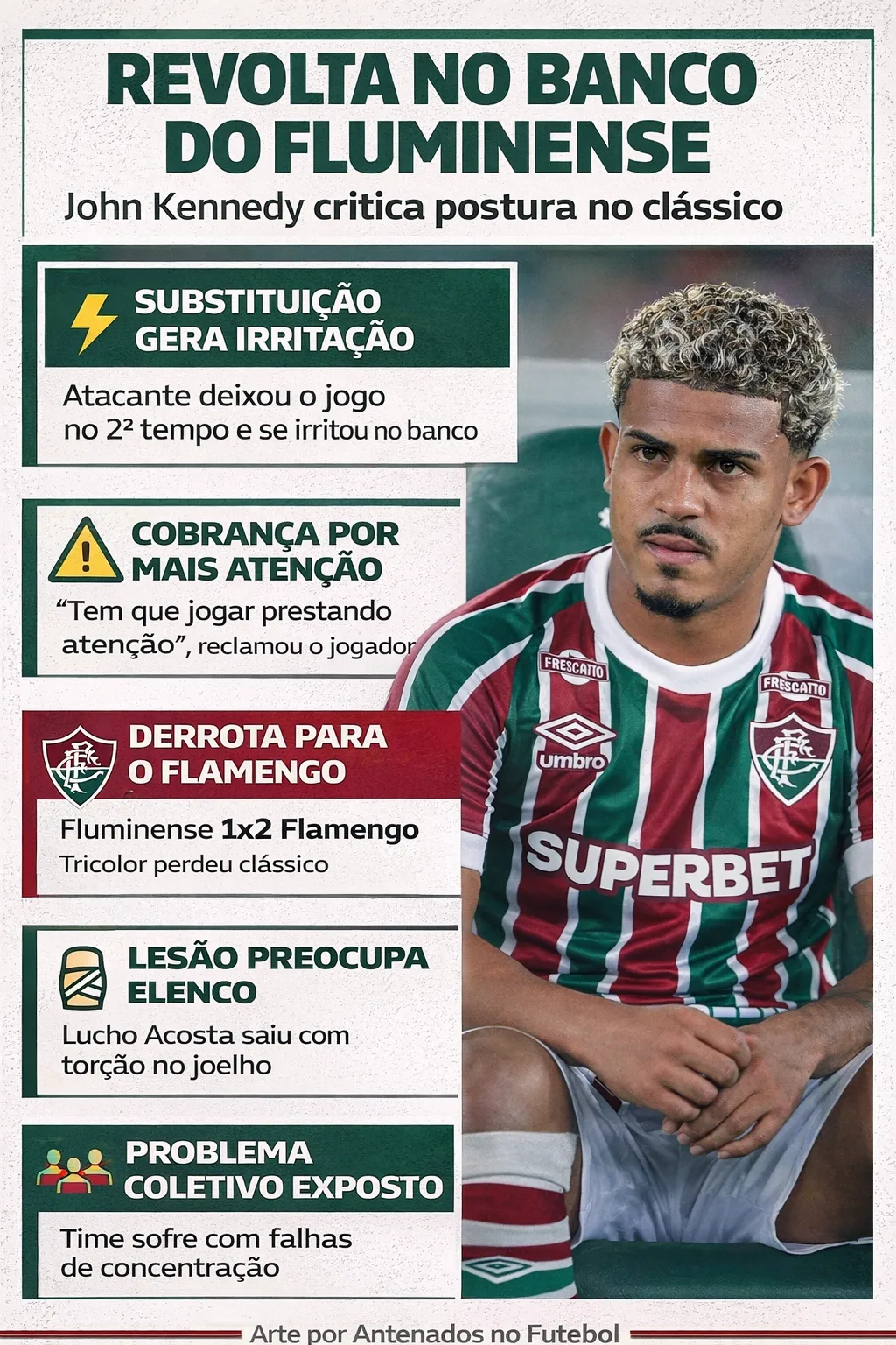O Fluminense enfrentou o Flamengo, no último domingo (12), em clássico que terminou com uma vitória Rubro-Negra por 2 a 1. Substituído no decorrer da segunda etapa, John Kennedy demonstrou grande irritação no banco de reservas, fazendo ponderações sobre o jogo que foram flagradas em leitura labial de Velloso.