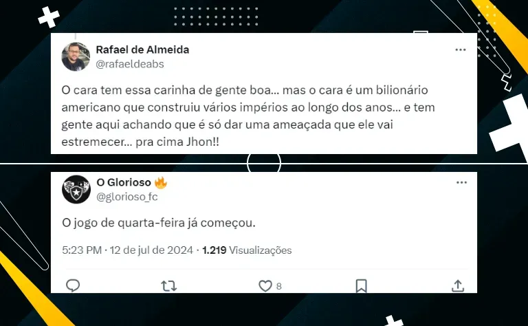 “Do ponto de vista de calúnia ou difamação, é claro. Ela faz uma campanha, dizendo na imprensa internacional que John Textor precisa pagar pelos crimes que cometeu contra a população, os clubes e as instituições do Brasil”, acrescentou.