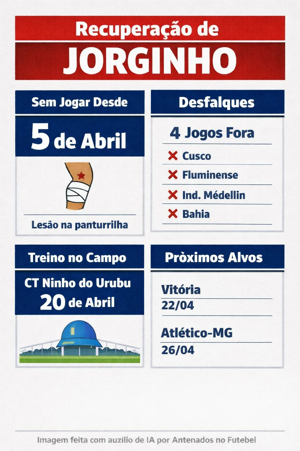 Jorginho não entra em campo desde o dia 5 de abril. Na ocasião, o camisa 21 sentiu dores na panturrilha durante o jogo contra o Santos no Maracanã pelo Brasileiro. Depois, a lesão muscular foi constatada e o ítalo-brasileiro iniciou tratamento.