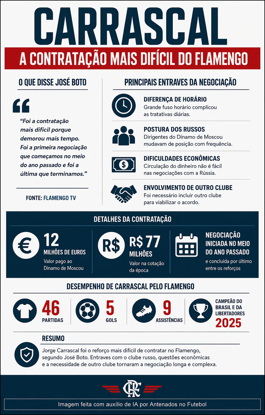 Ao contrário do que o alto valor pago pelo Mengão por Paquetá possa sugerir, José Boto classificou que Jorge Carrascal foi a contratação mais difícil de ser concretizada, muito por conta da postura dos dirigentes do Dínamo de Moscou, da Rússia.