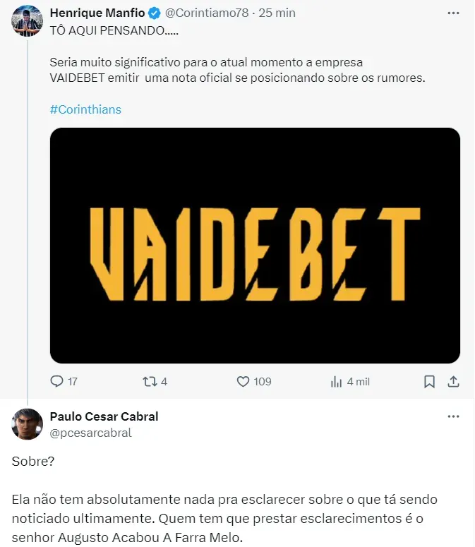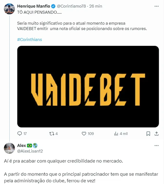 “Ela não está satisfeita com o Corinthians… eles não estão contentes com os resultados da publicidade e estariam interessados na rescisão de contrato. O valor a ser pago deve ser 10% do valor total de contrato, ou seja, na casa dos R$ 30 milhões”, disse.
