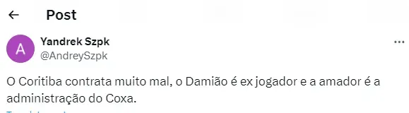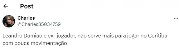 Falando um pouco mais sobre o resultado negativo, nas últimas horas, a torcida Coxa-Branca ‘disparou’ contra um jogador que foi titular no embate, o atacante Leandro Damião. Sendo assim, os seguintes comentários contra o centroavante viram à tona.