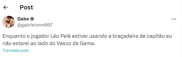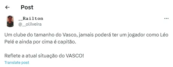 “Um clube desse tamanho, jamais poderá ter um jogador como esse e ainda por cima é capitão. Reflete a atual situação nossa!”. “Ele é um baita bagre, não pode ficar no nosso elenco”. “É a cara do fracasso, espero que seja negociado o quanto antes”.