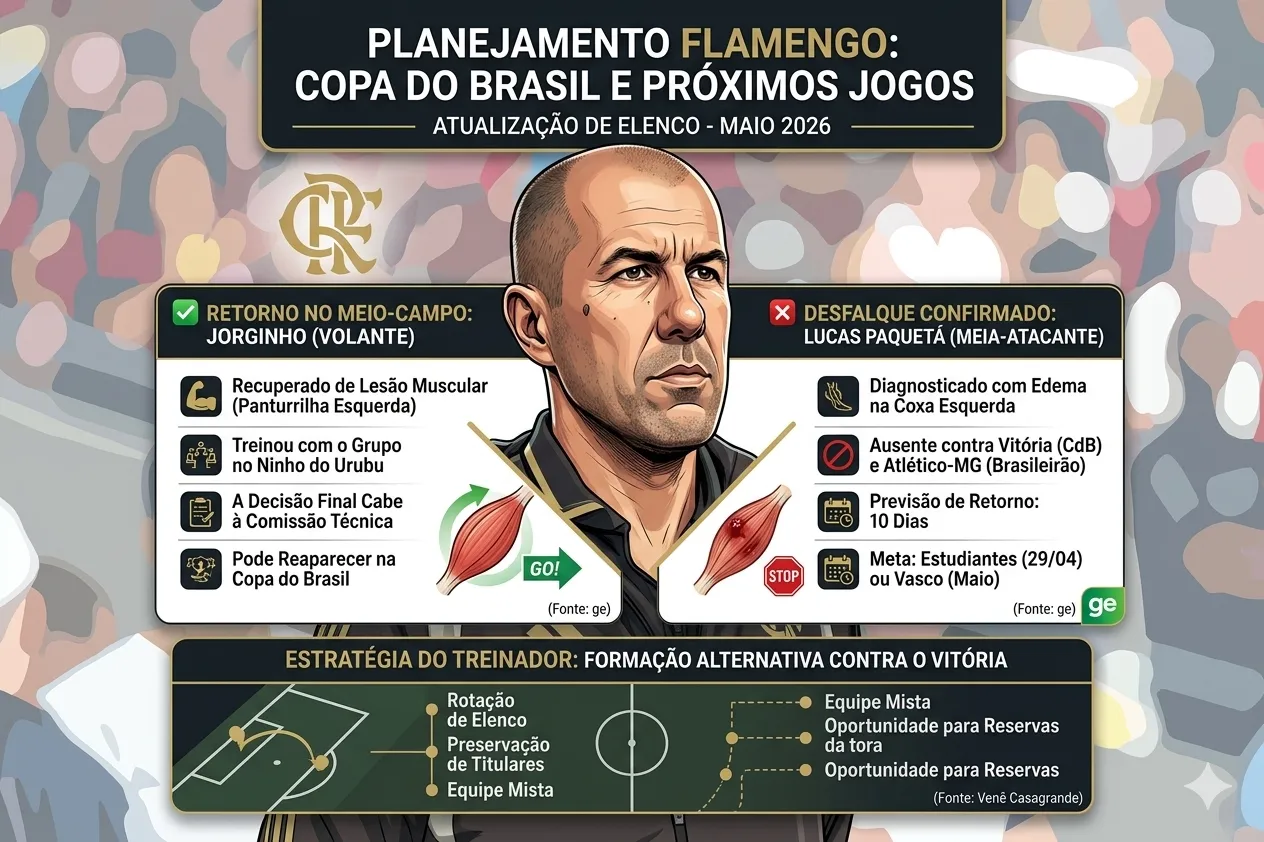 O trabalho tático realizado no Ninho do Urubu definirá quais peças ocuparão as vagas abertas pelas ausências e pelos retornos. Com a saída de Paquetá, abre-se espaço para novas configurações no setor de criação e marcação, onde Jorginho surge como opção para compor o grupo relacionado.