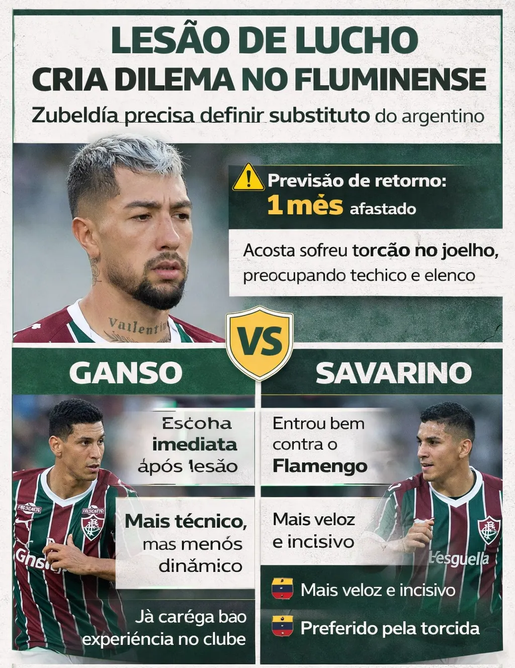 A lesão de Luciano Acosta chega em um momento especialmente delicado para o Fluminense, justamente quando o meia vivia seu melhor nível com a camisa tricolor. Peça central no funcionamento da equipe, sua ausência representa não apenas uma perda técnica, mas também de liderança dentro de campo, algo difícil de ser substituído em curto prazo.