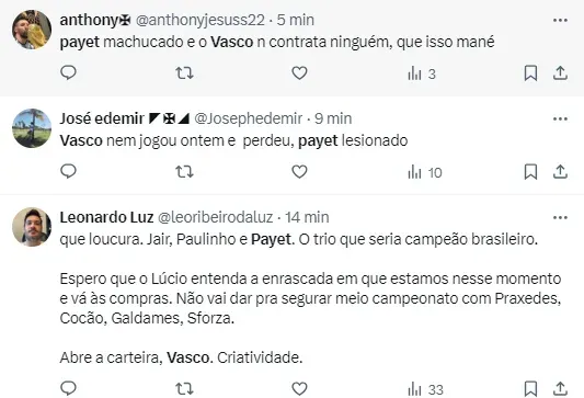 Vale lembrar que com a lesão do meia o clube carioca chegou ao seu terceiro desfalque importante antes do Brasileirão. Além de Payet, Jair e Paulinho seguem no DM se recuperando de rompimentos de ligamento cruzado anterior e só devem voltar em outubro.