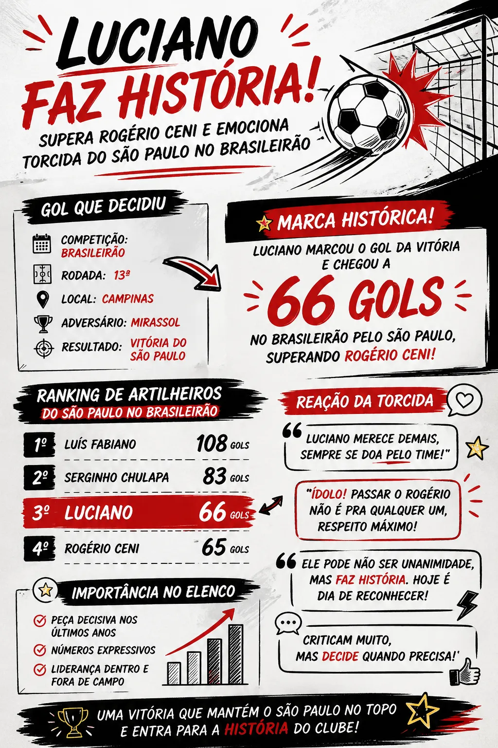 Portanto, com esse feito, Luciano passou a ocupar a terceira colocação na lista histórica do Tricolor em Campeonatos Brasileiros. À sua frente agora estão apenas Serginho Chulapa, com 83 gols, e Luís Fabiano, líder isolado com 108 tentos, consolidando ainda mais o nome do camisa 10 na história do clube.