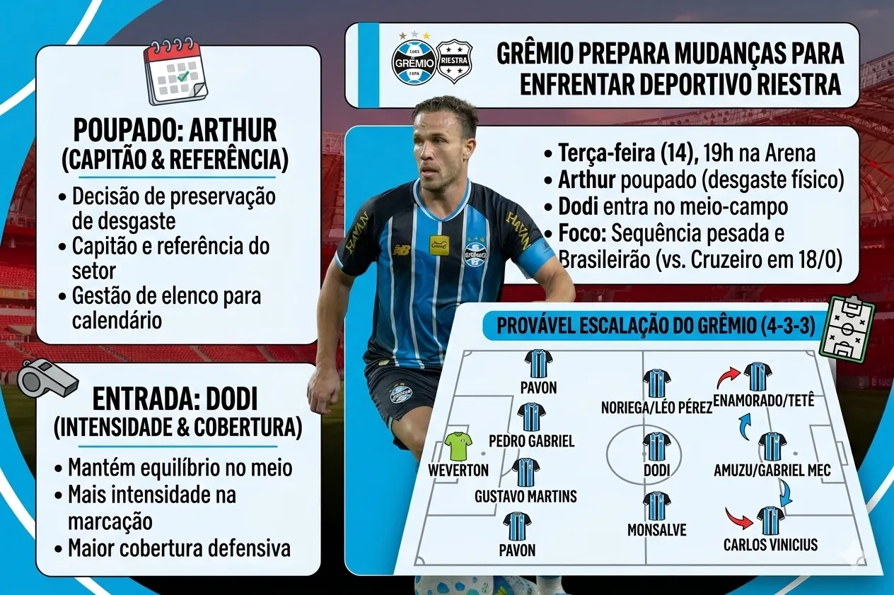 O Grêmio terá alterações na equipe titular para o confronto diante do Deportivo Riestra, agendado para esta terça-feira (14), às 19h, na Arena. A comissão técnica optou por preservar o meio-campista Arthur, que apresenta sinais de exaustão física após a sequência recente de partidas.