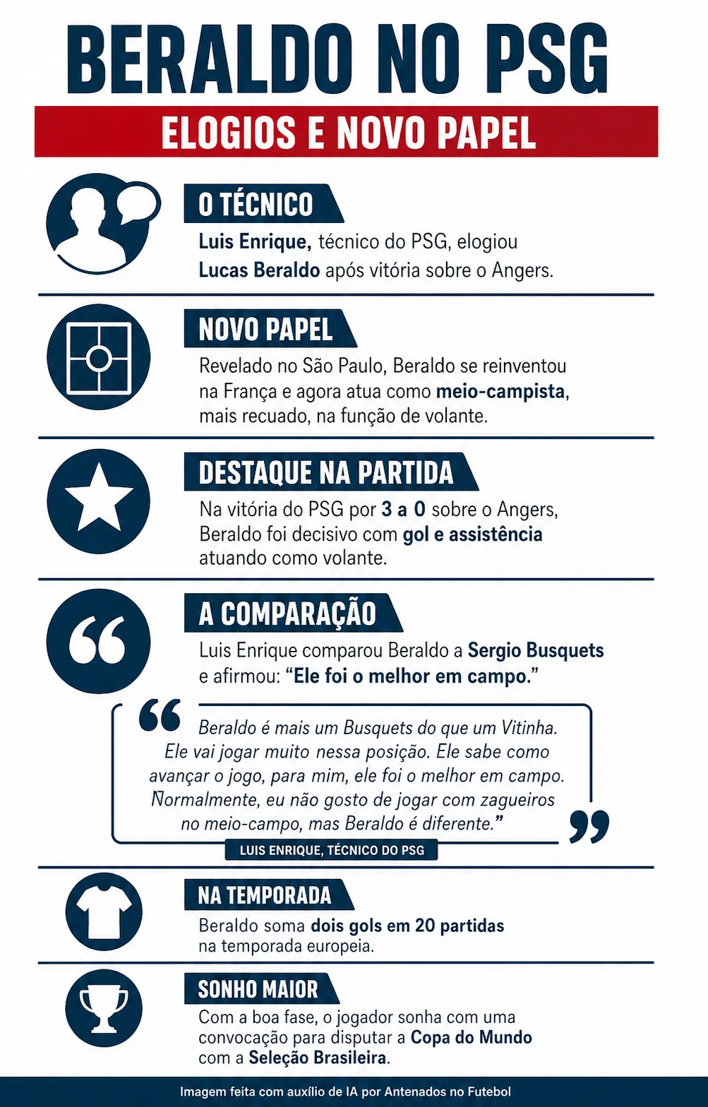 Inclusive, o treinador do Paris comparou o zagueiro de origem com Sergio Busquets, lenda do Barcelona e do futebol espanhol. Luis Enrique destacou a capacidade de Beraldo como um volante mais fixo.