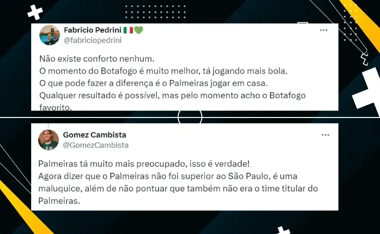 “Eu acho que o Palmeiras está bem confortável com o resultado e o jogo (contra o Botafogo, na Libertadores). Pela maneira como o Palmeiras olha para jogar em casa, por conseguir reverter placares…”, disse. Na sequência, o ex-jogador Luis Fabiano respondeu.
