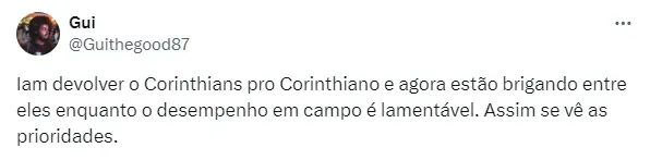 “Essa exposição negativa do Corinthians é inadmissível e acontece ao mesmo tempo em que o retrospecto do departamento de futebol mostra um desempenho abaixo do esperado para a grandeza do Clube”, acrescentou.