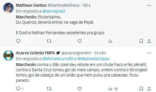 Com a ausência do argentino, Caíque acabou emendando uma sequência entre os titulares na meta do Imortal. Sem Marchesín, o atleta foi acionado em cinco das seis partidas. Já Gabriel Grando teve somente uma oportunidade. Agora que está de volta, o argentino quer mais do que nunca recuperar o seu posto na equipe e mandou o papo para Renato Gaúcho que está perto de uma marca na competição.