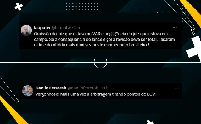 O lance em questão teve até revisão do VAR, mas o árbitro da partida sequer foi chamado para avaliar o lance, mesmo com uma grande pressão dos jogadores do Vitória, que além da mão, reclamaram de um possível empurrão de Dinenno.