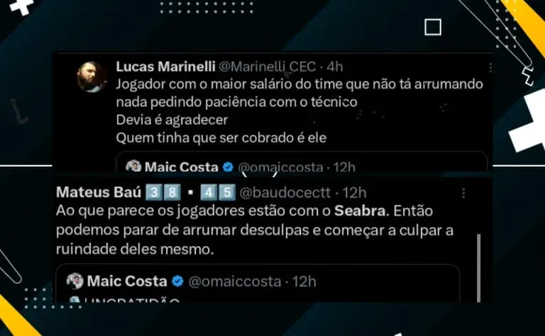 “Meses atrás, a torcida dizia que o Seabra era o cara. Acho um pouco ingrato, minha opinião sincera e respeitando a de cada um. Tem que acreditar no trabalho, temos que seguir nessa linha.Seabra é um excelente treinador, não foi fácil o que ele fez com a gente ano passado, então acho um pouco injusto o que estão fazendo, a pressão que está tendo. Deixa ele fazer o trabalho tranquilo”, disse.
