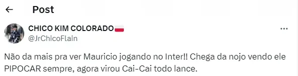Todavia, se o ‘camisa 19’ realizou um bom jogo, o mesmo não pode ser falado do meio-campista Maurício. Após uma partida abaixo do esperado, a torcida colorada não teve papas na liíngua e tratou de descer a lenha no titular de Chacho Coudet (SIC).