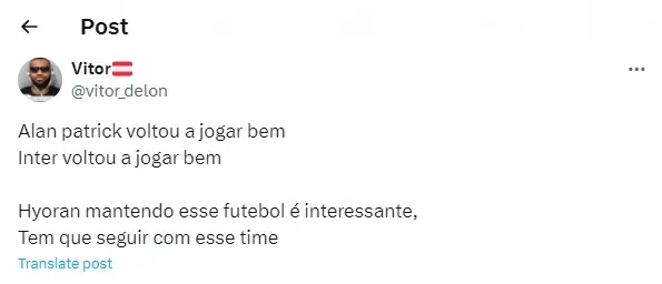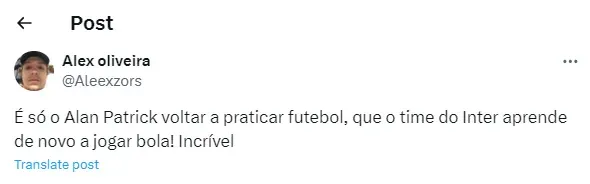 Todavia, mesmo ainda festejando o grande resultado, nas últimas horas, outro assunto chegou ‘fervendo’ nas alamedas do Maior do Sul: uma declaração do meio-campista Alan Patrick sobre envolvendo a torcida do Sport Club Internacional.