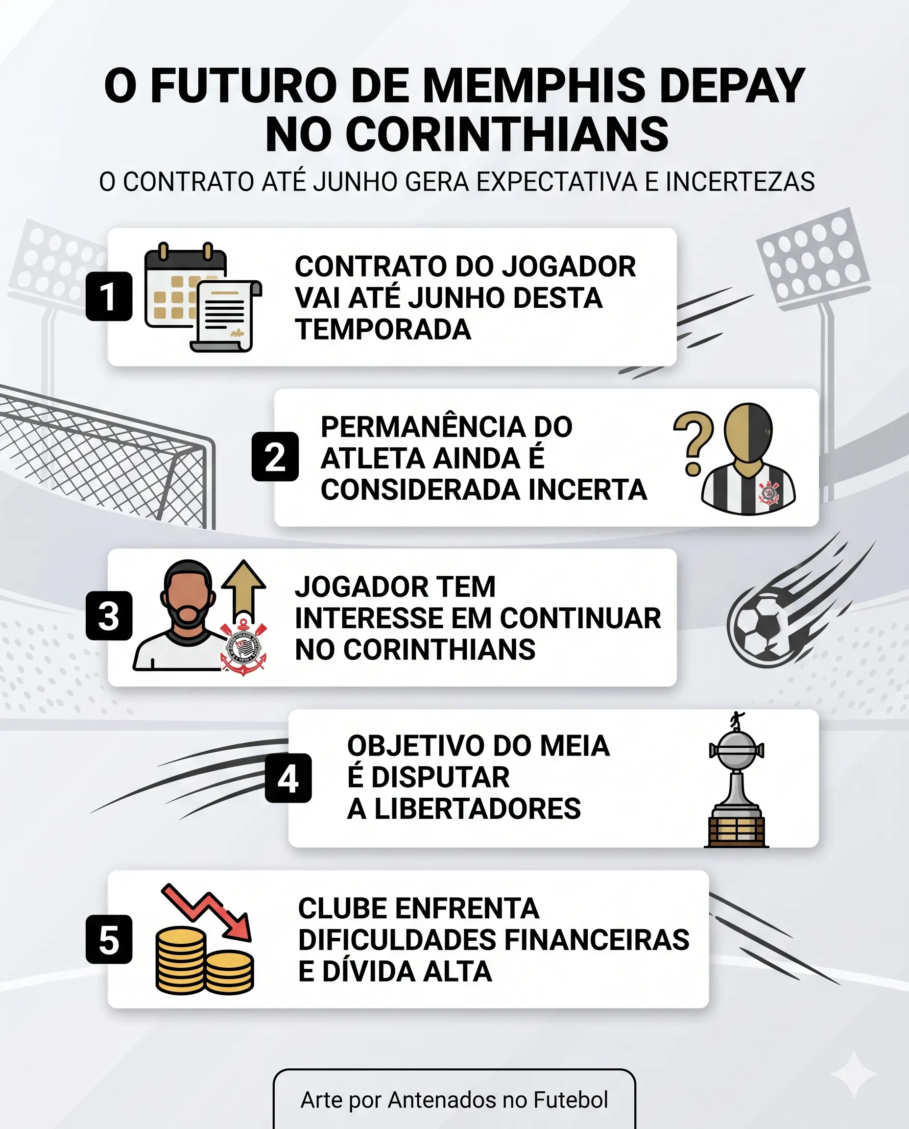 A a possível renovação de Memphis Depay precisa estar alinhada à realidade financeira do Corinthians. O jogador possui qualidade técnica reconhecida, mas o alto custo mensal pesa no planejamento do clube. Diante do cenário atual, a decisão passa diretamente pela capacidade do Corinthians de equilibrar desempenho esportivo e sustentabilidade econômica.