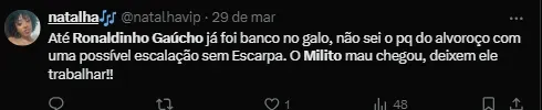 Milito também falou sobre sua familiaridade com o clube mineiro e alguns termos locais, como “massa” e “Galo”. Ele mencionou que fez muitas pesquisas antes de assumir o cargo no clube.