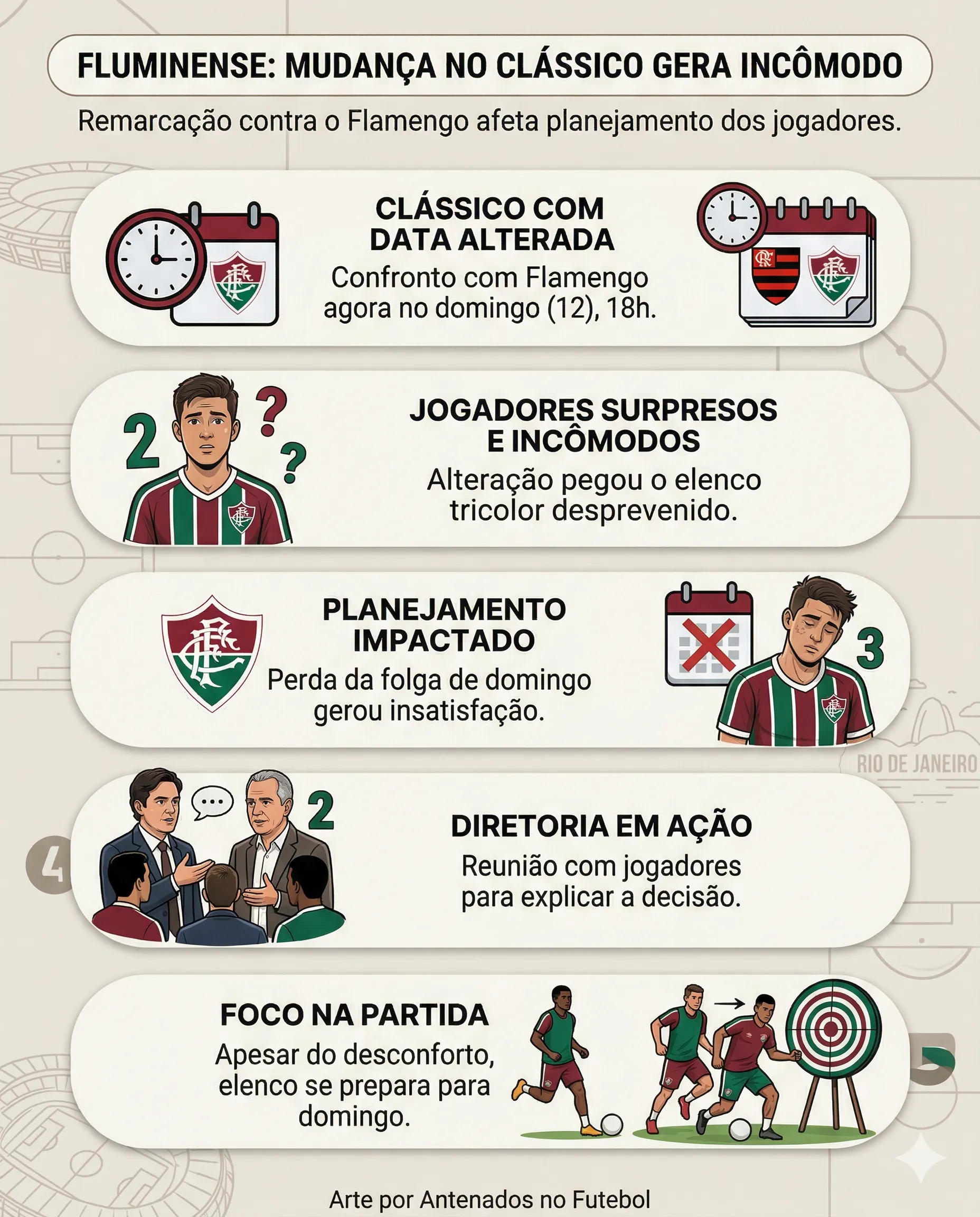 A mudança na data do clássico impactou diretamente o planejamento dos atletas do Fluminense. Parte do elenco demonstrou insatisfação ao perder a folga que estava prevista para o domingo (12), o que gerou um desconforto inicial no grupo.
