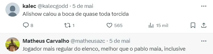 Apesar disso, outro tema veio à tona na torcida: Alisson. O meio-campista está jogando um bom futebol e dessa forma, vem recebendo elogios. No programa Donos da Bola, da TV Bandeirantes, Neto e Souza comentaram sobre o atleta.