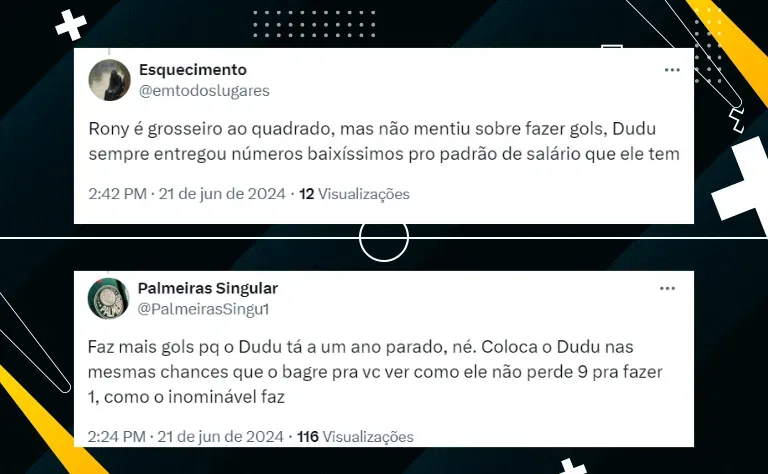 “O Rony não é craque, mas faz mais gols que o Dudu. Pra mim, hoje, o Rony é melhor que o Dudu pro Palmeiras. Muito mais importante, muito mais eficiente!”, disse o ex-jogador durante seu programa na TV Bandeirantes.